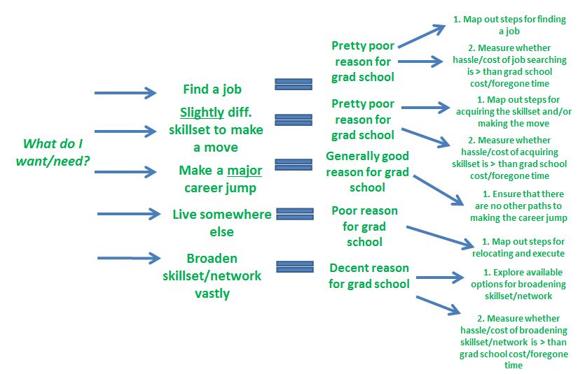 2.       You need a slightly different skillset to make a move. I underlined ‘slightly’ because this is an important nuance. Example: If you’re on the accounting side of a business but you want to move to the deal-making side of the business, skill-wise, you are not far away enough to warrant going back to business school. In fact you, you’re likely very close and simply need exposure to the business. Again, this likely requires that you network and use your resources wisely, not run off to school. If you’re in this position, strongly consider spending time with mentor(s) and mapping out a path to your desired job that does not include grad school.